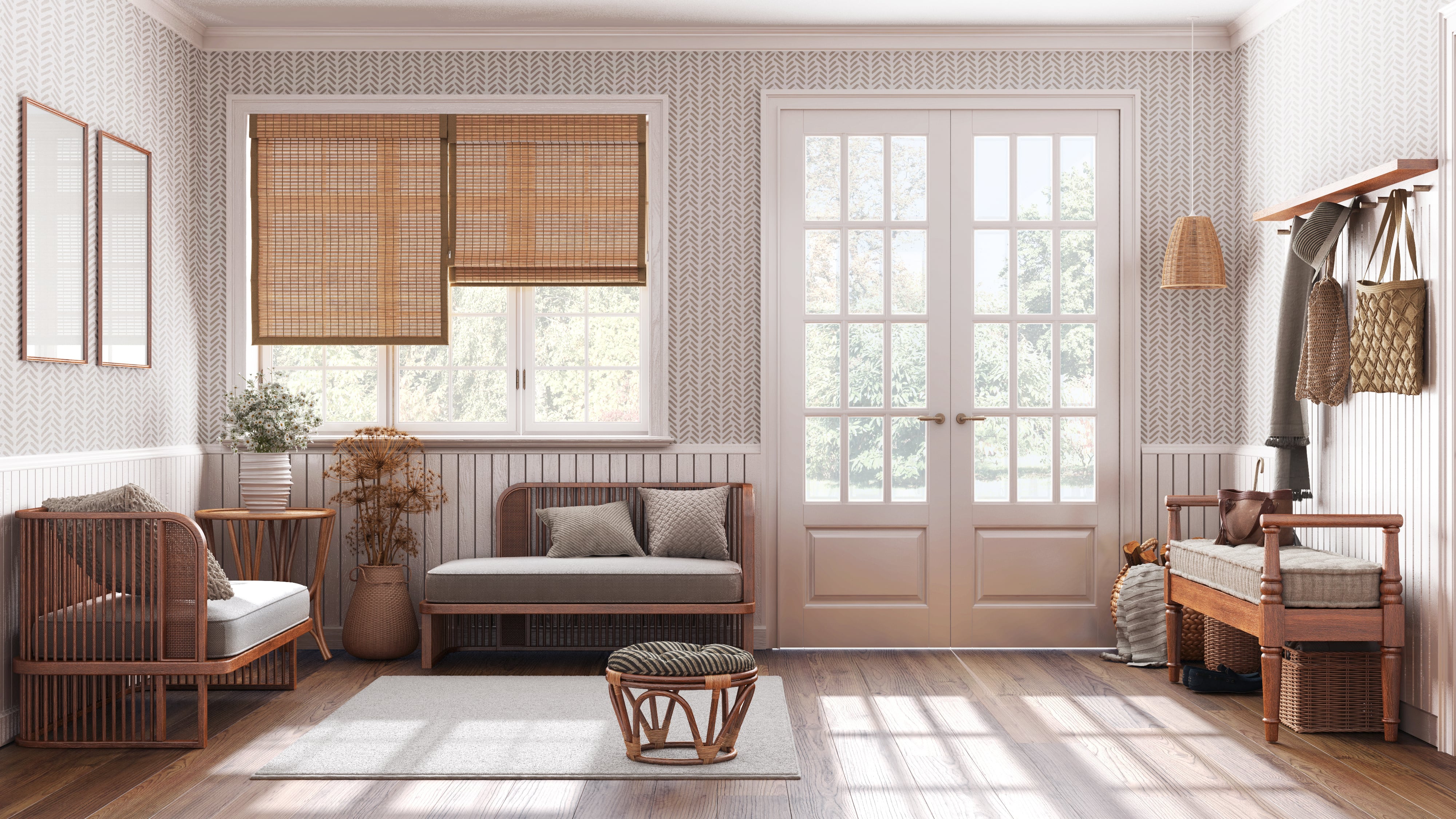 Warm and cozy with rough edges, a casual and pragmatic style, aged metals, tweeds, weaves, woods of all types and shades, raw and recycled, black and white, patinaed paint …countrified eclectic design with modern touches for a very current feel